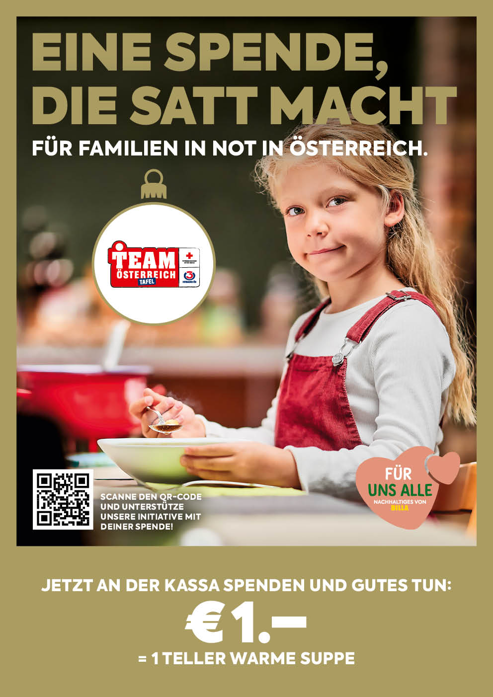 Auch in diesem Jahr setzt BILLA mit der Aktion "Eine Spende, die satt macht! 1 Euro = 1 Teller Suppe" ein Zeichen und unterstützt die Team Österreich Tafeln, eine Initiative von Rotem Kreuz und Hitradio Ö3.
